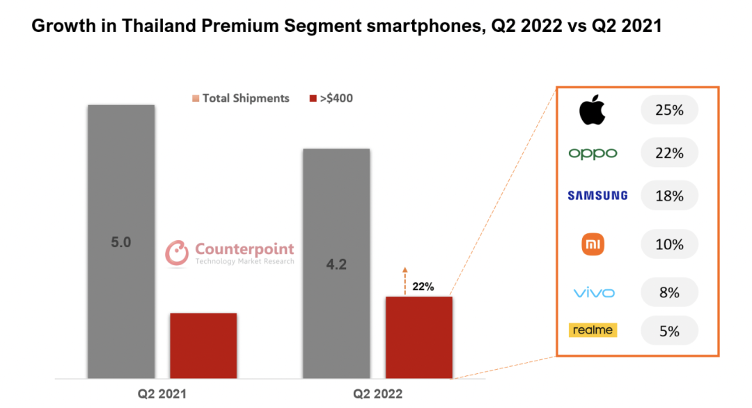 Counterpoint:泰国高端智能手机市场在 2022 年第二季度同比增长 22%