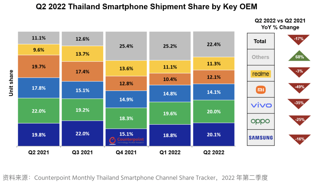 - 在微观环境疲软带来的影响下,泰国 2022 年Q2智能手机出货量同比下降 17% 至 420 万部。