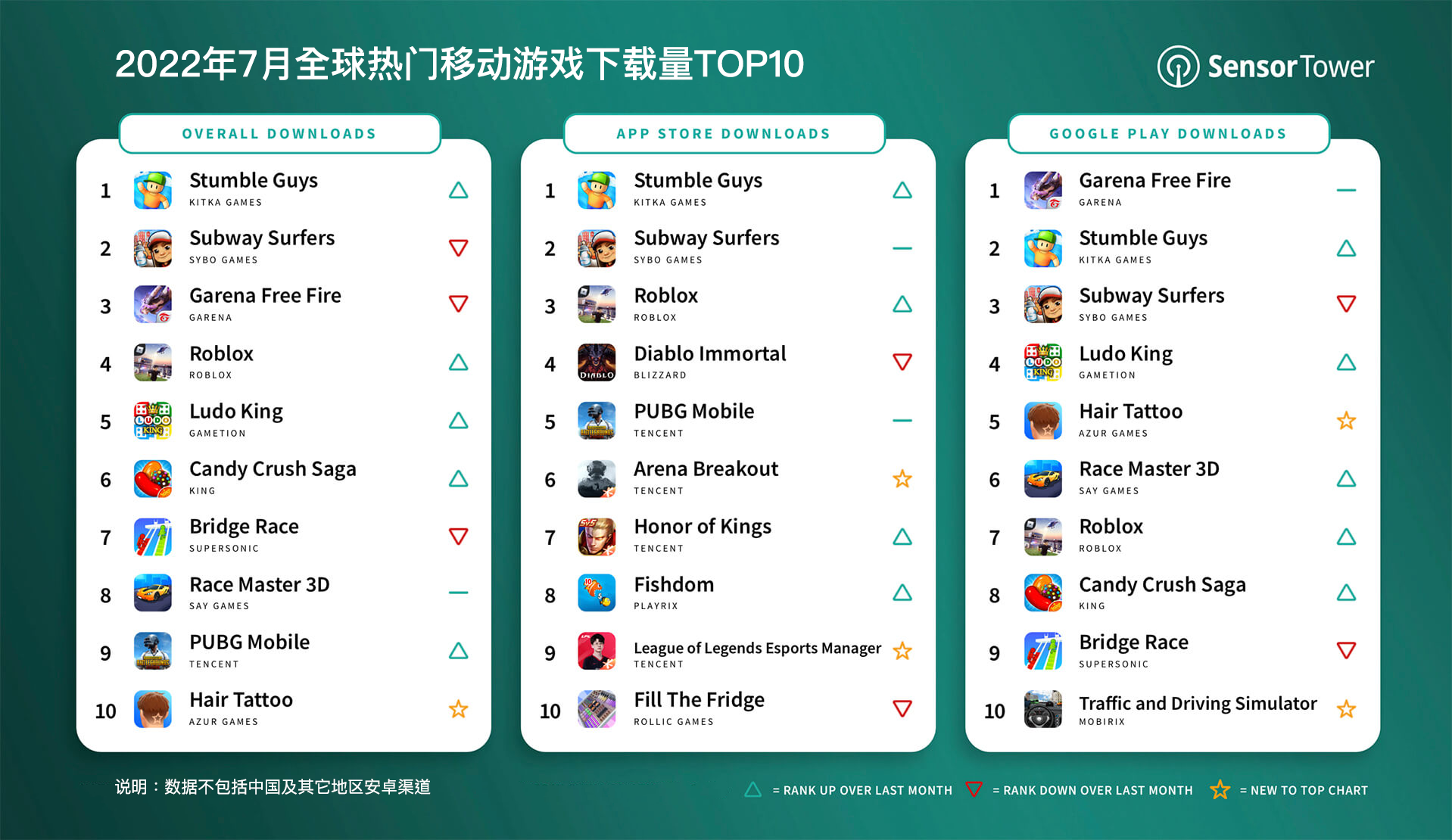 Sensor Tower:7 月全球手游下载量 48 亿次,同比增长 1.5%