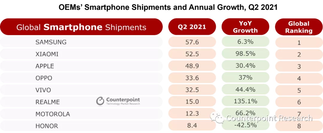 现在,首要的智能手机OEM厂商都在产品组合中加大了5G产品权重,在新式商场尤为如此。其间,realme在遍及5G手机方面体现活跃。在新式商场中,realme的5G手机在其出货量中的份额从一季度的8.8%上升到二季度的15.9%,位列苹果和Oneplus之后,排名第三。从全球规模来看,realme的出货量同比添加高达135%,到达1500万部,初次获得第六的方位。其间,5G设备在其二季度全球出货量中占37.0%,较一季度的22.7%亦有所添加。