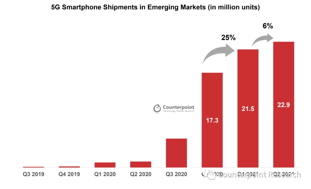 新式商场5G智能手机出货量的快速添加能够归功于iPhone 12,这是苹果首款支撑5G的智能手机产品。于此一起,其他OEM厂商,如OPPO、vivo、小米和realme在入门级的细分商场中加大了5G产品的布置。在新式商场,特别是东南亚和中东区域,5G基础设施建造方面正在迎头赶上,因此在未来几个季度,这些国家对入门级5G手机的需求将会不断添加。
